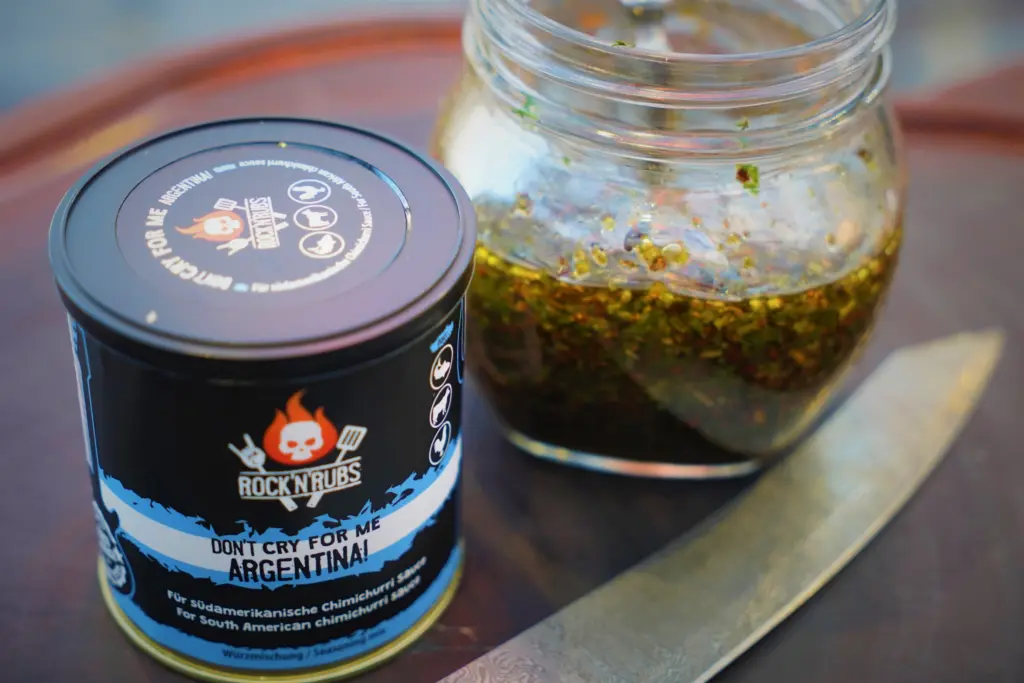Chimichurri is THE classic South American grilling sauce and marinade – perfect for steak, but also great with veggies, grilled cheese, fish, and poultry. Simply let 1 tablespoon of Chimichurri soak in 1 tablespoon of lukewarm water for a moment, then mix with 3 tablespoons of quality olive oil and 1 tablespoon of red wine or red wine vinegar.