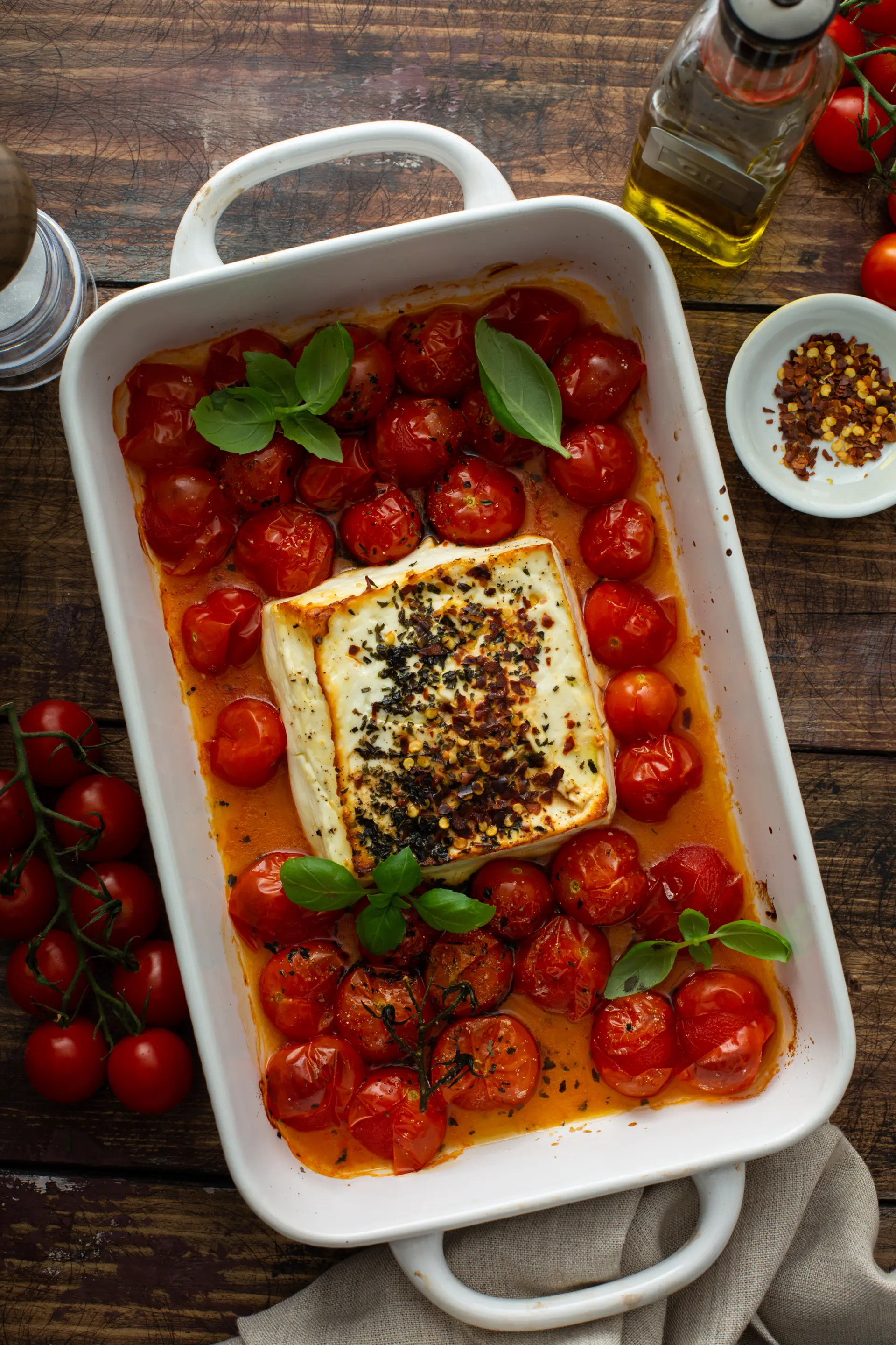 Bake in the preheated oven for 20–25 minutes, until the feta is lightly golden and the tomatoes are soft and juicy.