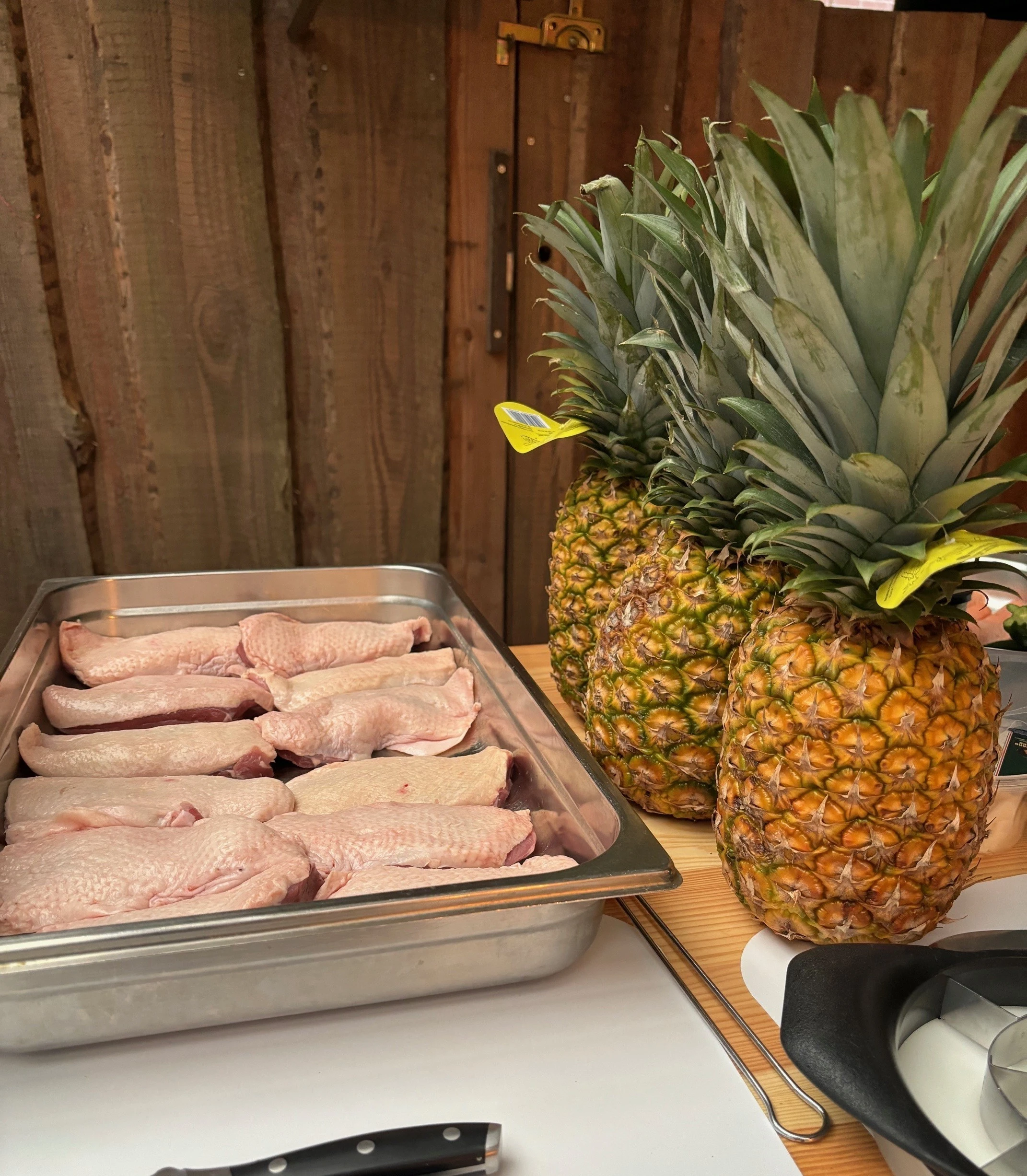 Place the pineapple plank in the indirect heat zone and set the duck breast on top, skin side up. Cook with the lid closed until the internal temperature reaches 62–65°C (for juicy, pink meat).