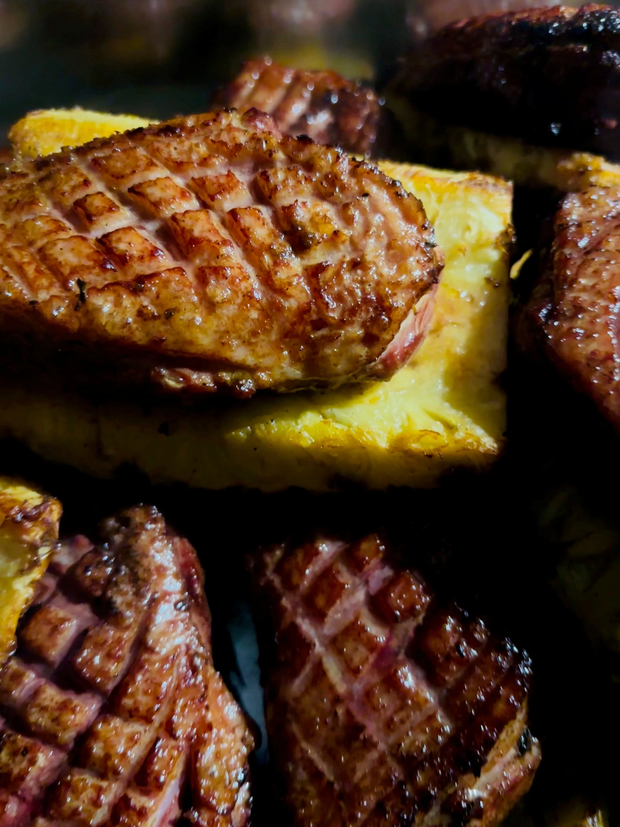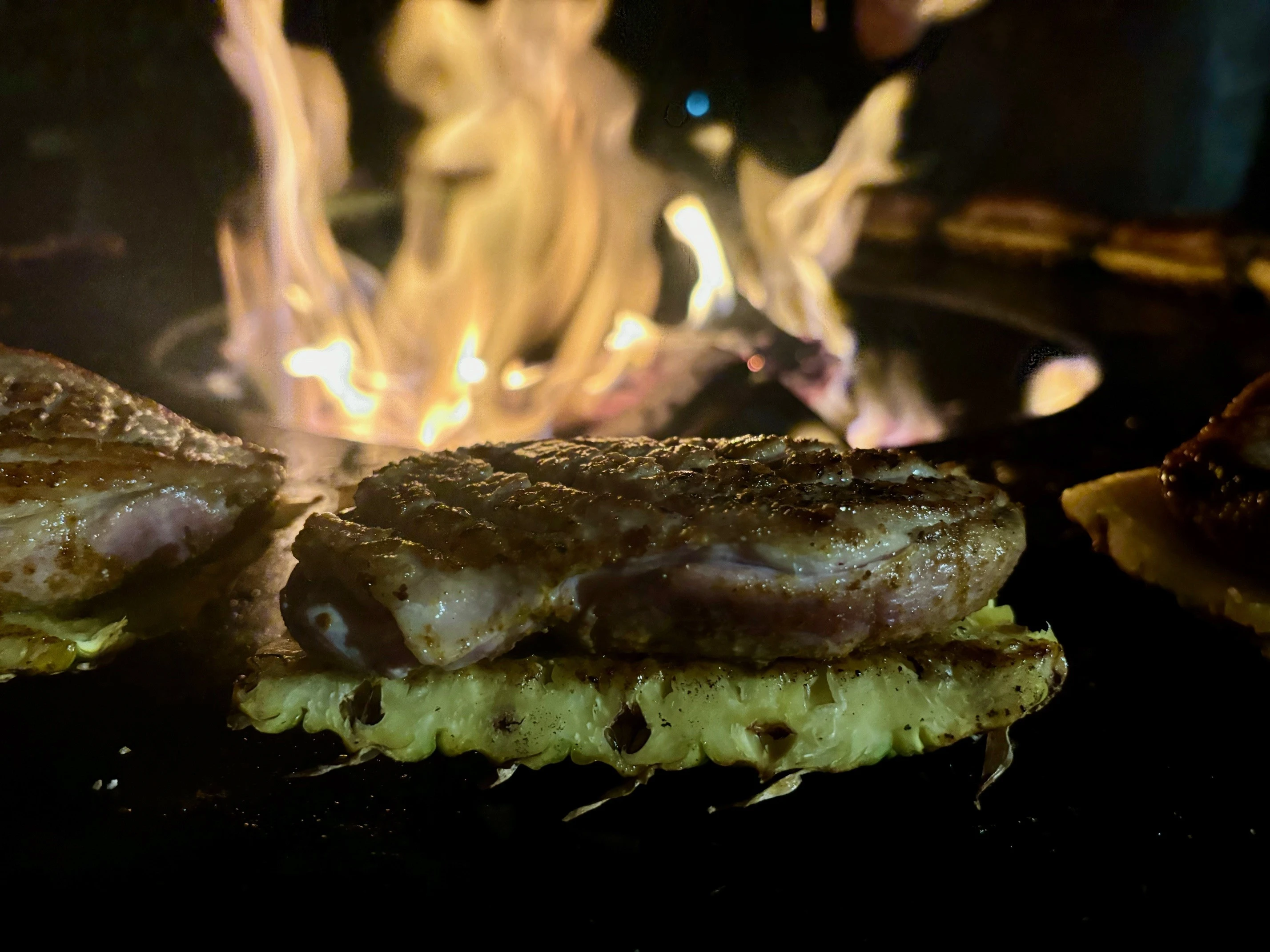 - Briefly toast the inside of the pineapple planks directly over the heat for 1–2 minutes.