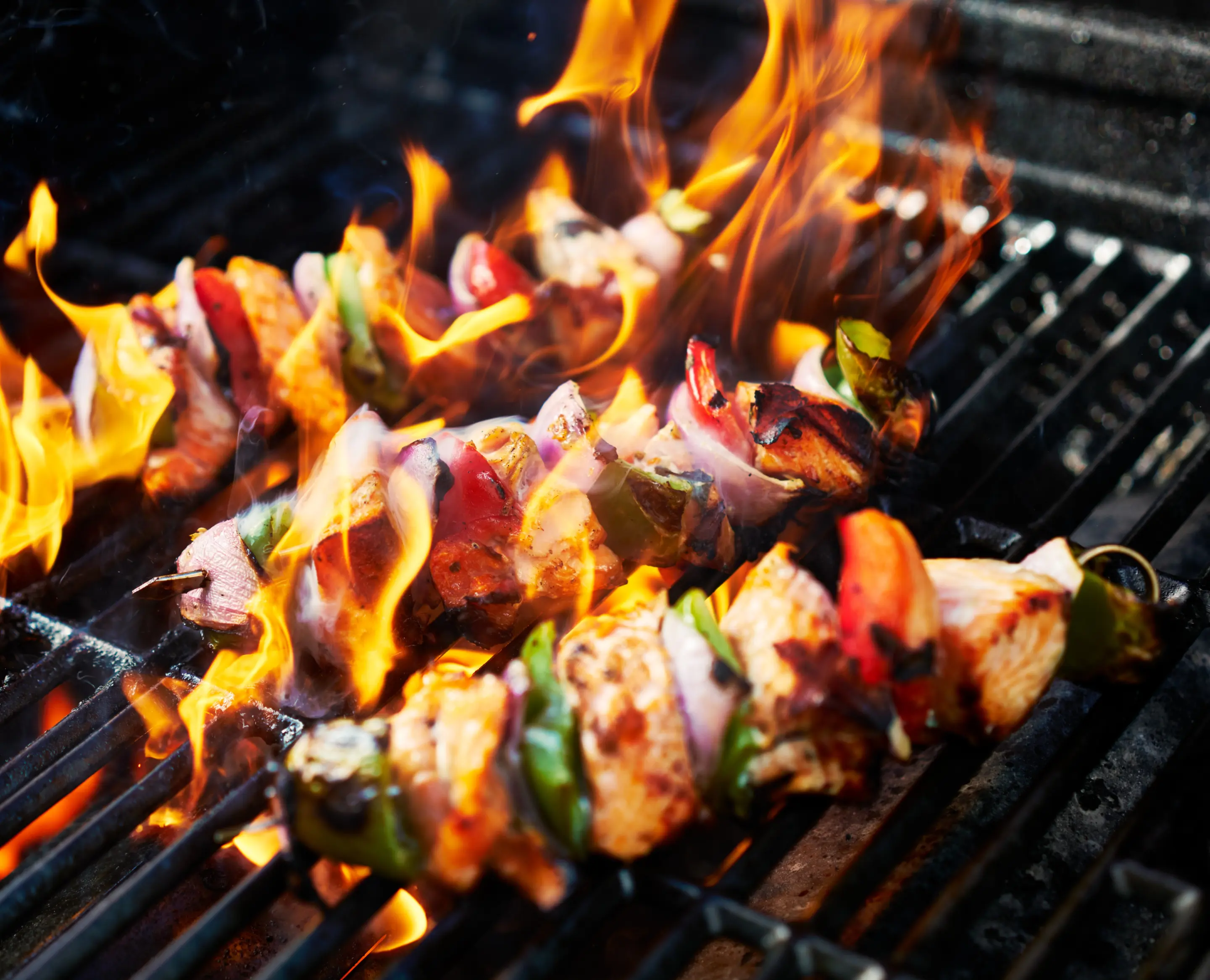 Stel de grill in op indirecte hitte. Gaar de spiesjes eerst indirect, rooster ze daarna kort direct boven hoge hitte tot er mooie geroosterde aroma’s ontstaan.