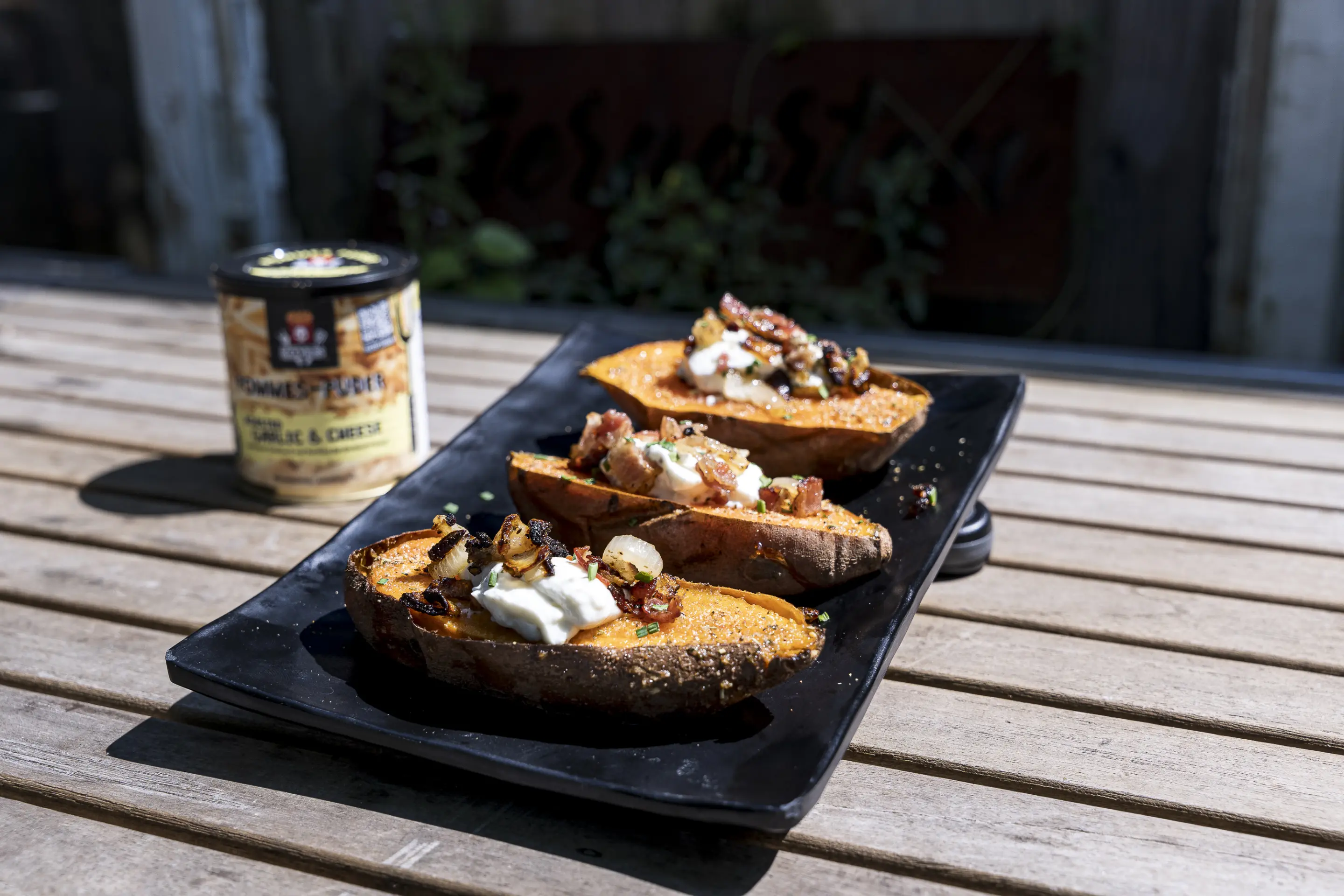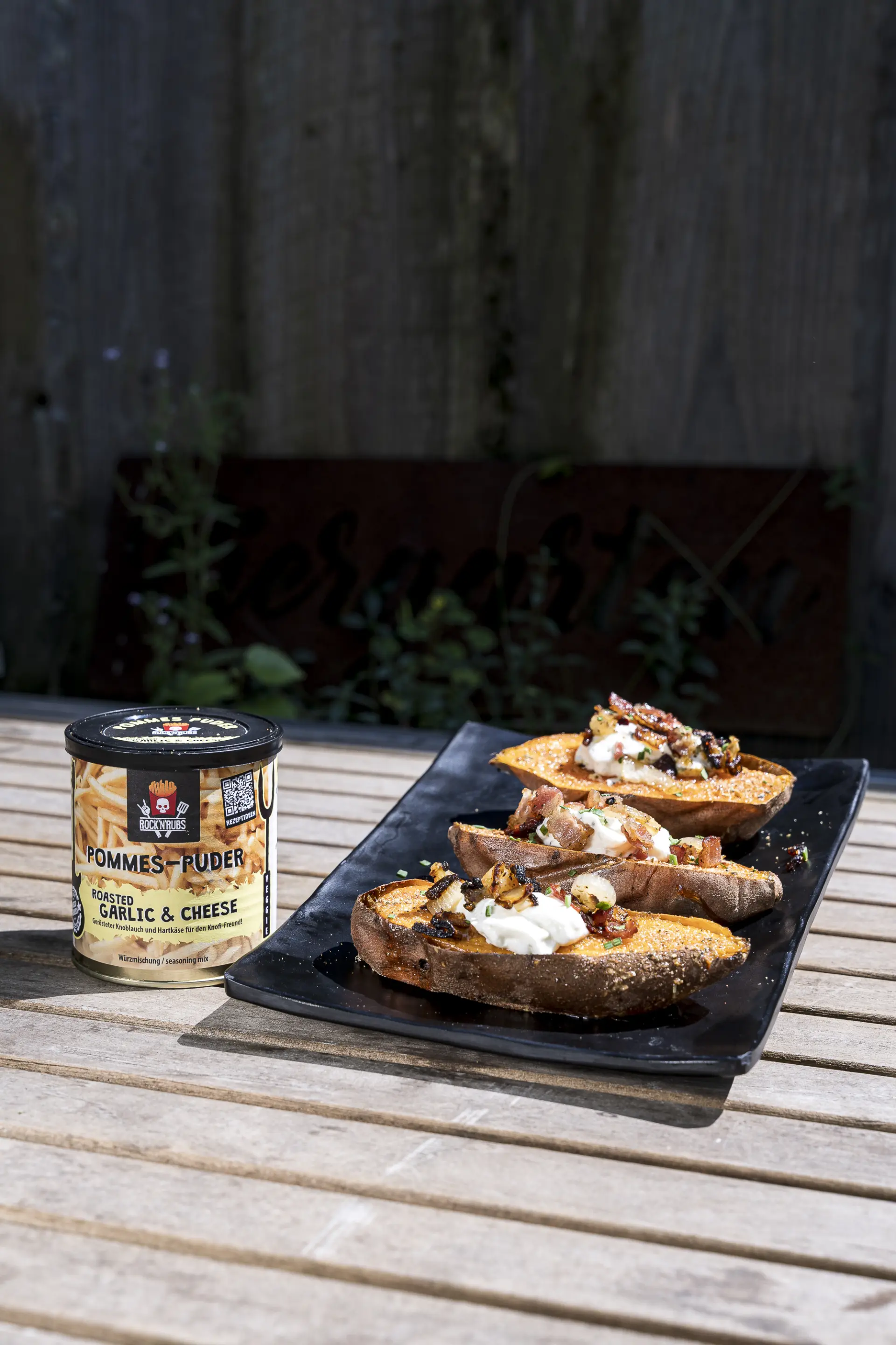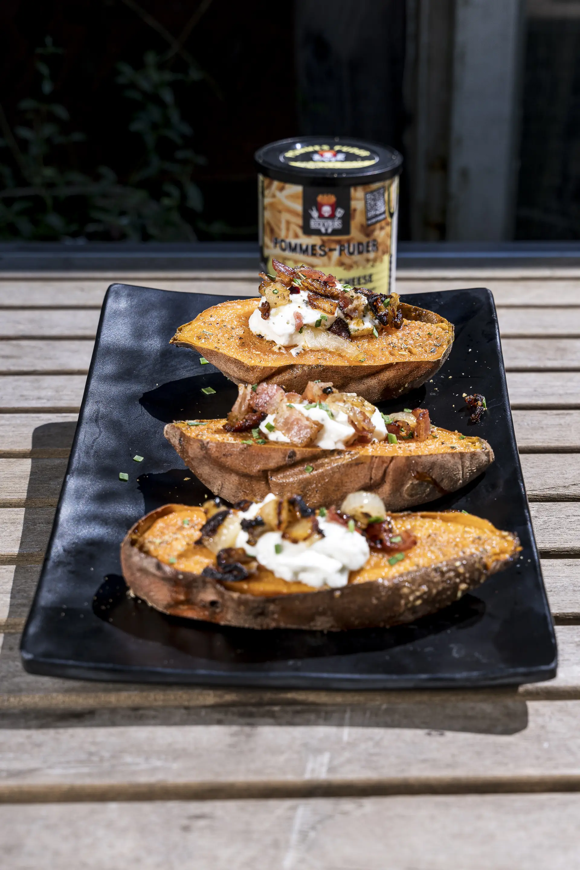 Süßkartoffeln waschen, längs halbieren. Schnittflächen rautenförmig einschneiden (nicht zu tief). Mit Olivenöl einreiben und großzügig mit Pommes-Puder „Roasted Garlic & Cheese“ würzen. Mit der Schnittfläche nach oben aufs Blech legen.